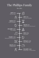 Select your favourite colour scheme and font, and then choose from our selection of icons to add to your Timeline. Add your dates and labels for each special event - births, weddings, milestone birthdays, holiday adventures, the possibilities are endless. Finish the whole thing off with your own personal caption.